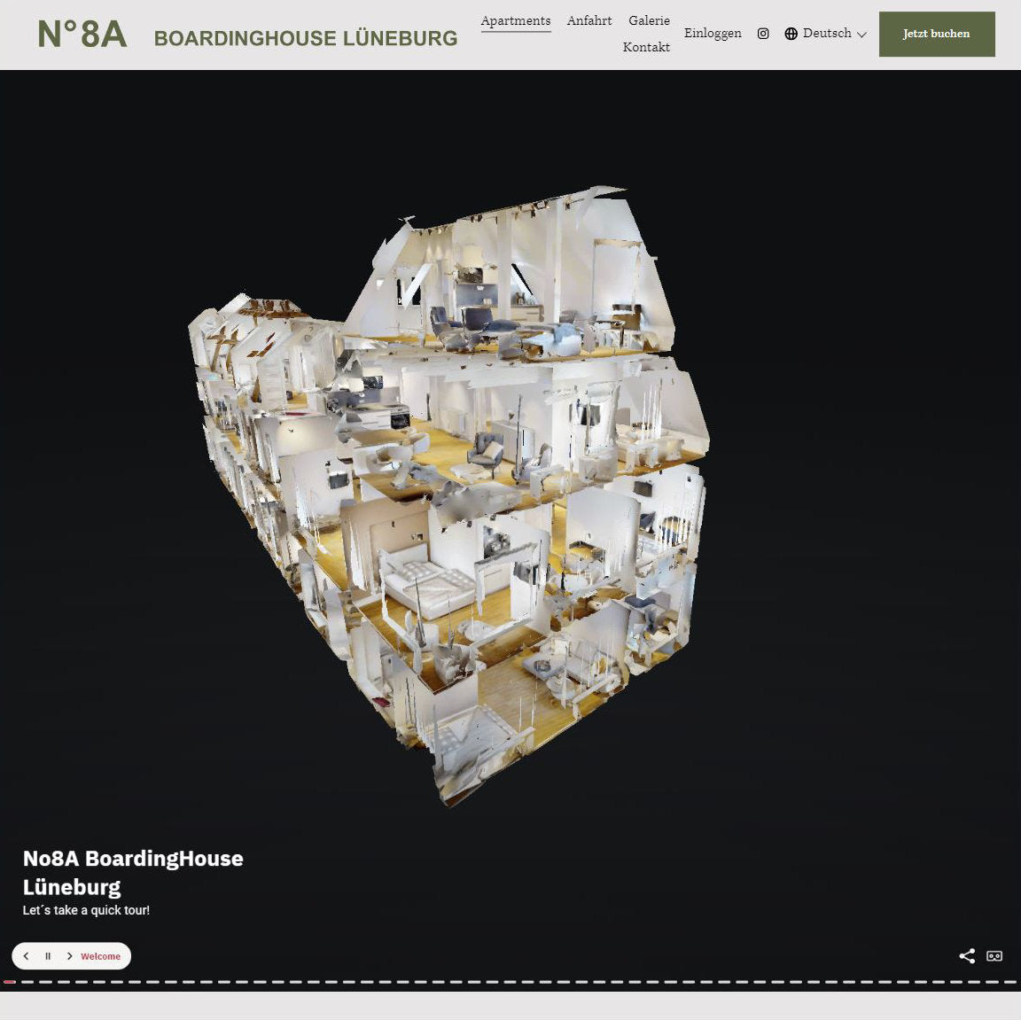 No8A Boardinghouse uses our Matterport 3D Tour and assets for listings on their website and on various booking platforms. We have furthermore integrated a booking engine, automatic digital key generation, and a property management system.
