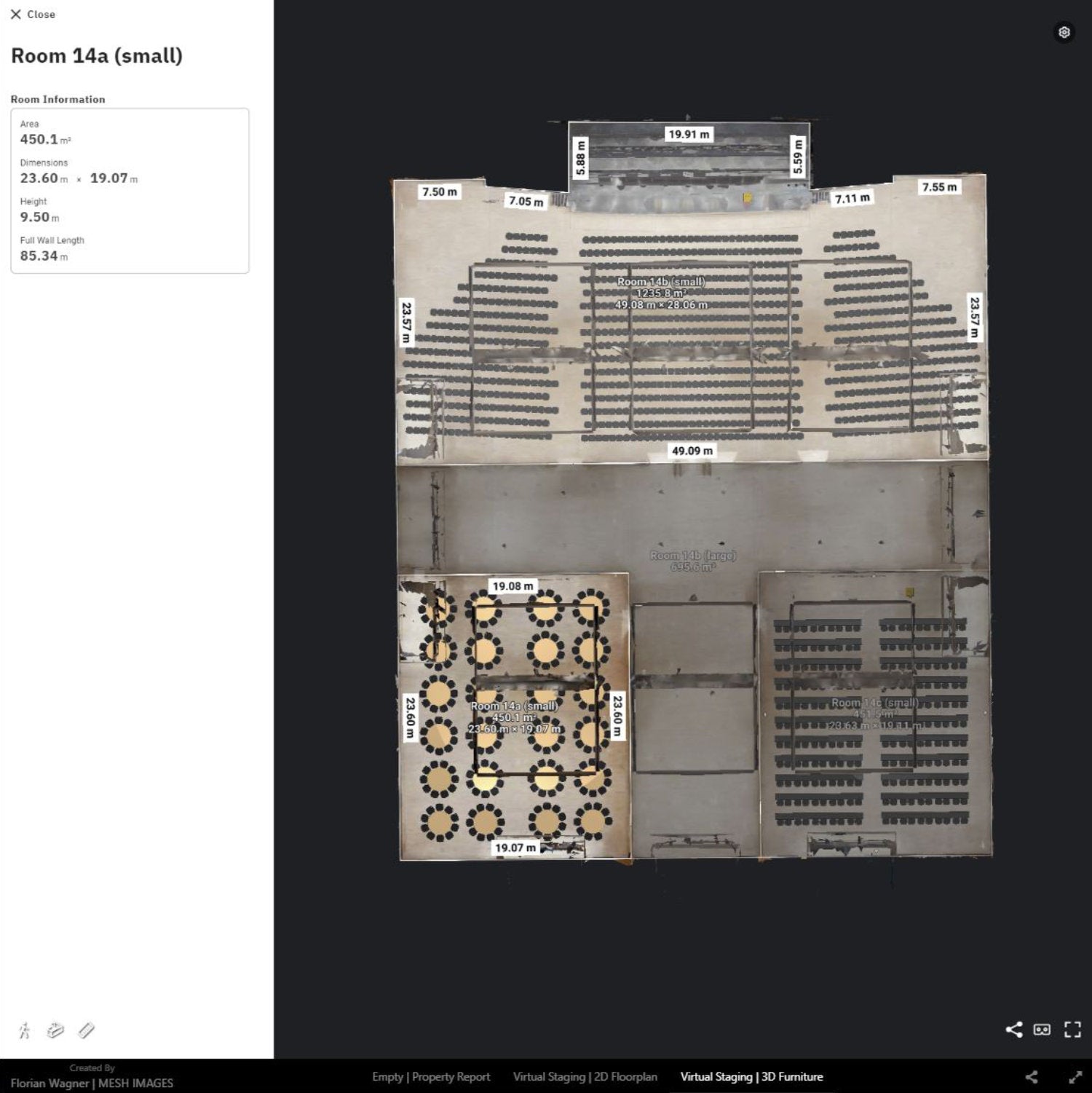 Access important room scale data instantly with automated property reports by Matterport. Visualize 2D floorplans or 3D assets with Virtual Staging.